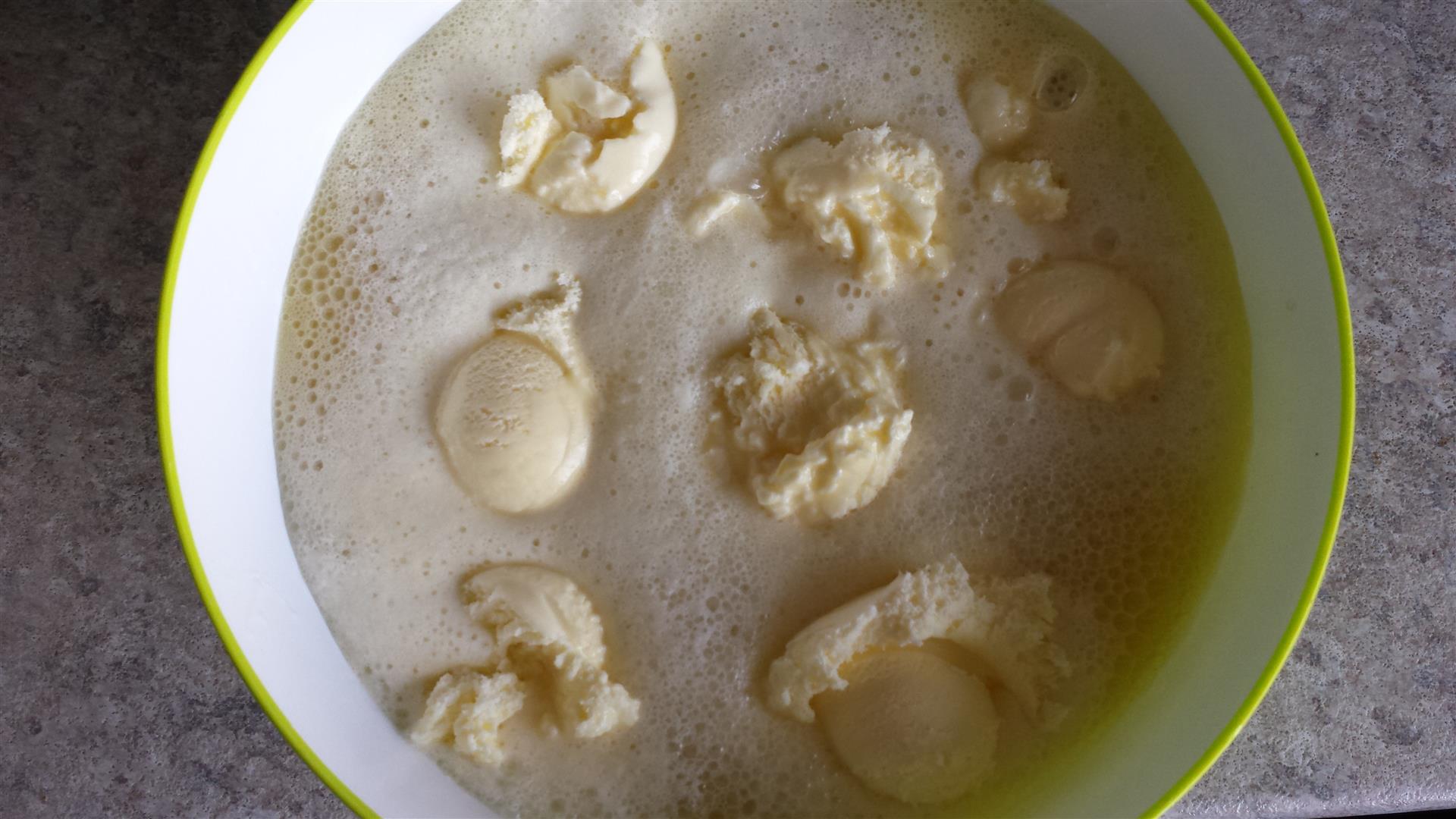- scoops of vanilla ice cream roughly covering half of the surface area