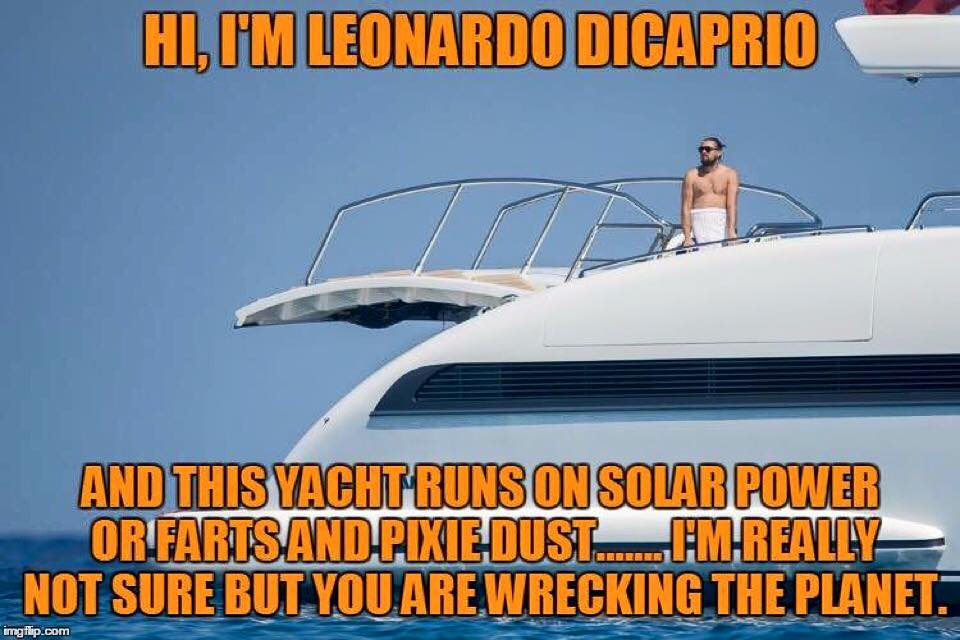 He owns several multi-million dollar mansions, a yacht, an island and constantly flies on charter jets. I am a firm believer that CO2 is insanely beneficial to human kind and the earth but let’s look at CO (the yucky stuff that comes out of the exhaust of vehicles) and other pollution that is actually bad for the environment. Ass hats like Leonardo spew more pollution in one day than the majority of us do in our lifetime. Why are these idiots using a few minutes at a microphone to talk about the hoax when they could take their hundreds of millions of dollars and do something that could actually help the world.