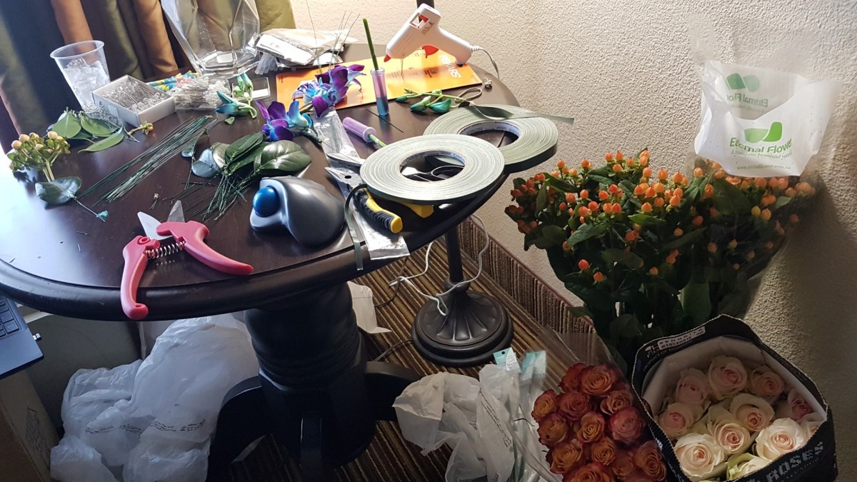 20180906_173327_work-area (Large) Published 2018-09-20 at 1920 × 1080 in My Last Secret ← Previous Next → I took over my mother’s hotel room as floral central for the wedding… I owe her big time for that night.