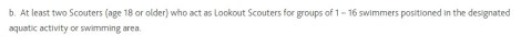 The policy restricts swimming activities not at a pool. At least one “water activity supervisor”[1] per ten swimmers, any youth acting as “Water activity supervisors” must have Bronze Cross and be 16. “Water activity supervisors” must be within “easy reach”[2] of swimmers. I assume, and always have, that adults qualify as “water activity supervisors” and easy reach means you can reach the swimmer before they disappear from reach. Water depth, clarity, and current are some factors that must be assessed here.