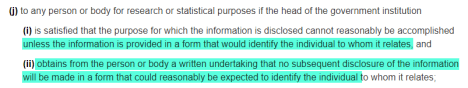 Section 8(2)(j)(ii) also states that the head of the government institution (this would be Peter Routledge though he just took over the role in April of 2021) “obtains from the person or body a written undertaking that no subsequent disclosure of the information will be made in a form that could reasonably be expected to identify the individual”.